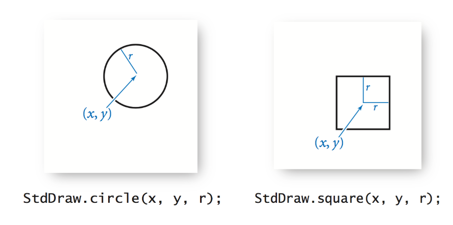 circle(double x, double y, double radius)ellipse(double x, double y, double semiMajorAxis, double semiMinorAxis)square(double x, double y, double halfLength)rectangle(double x, double y, double halfWidth, double halfHeight)